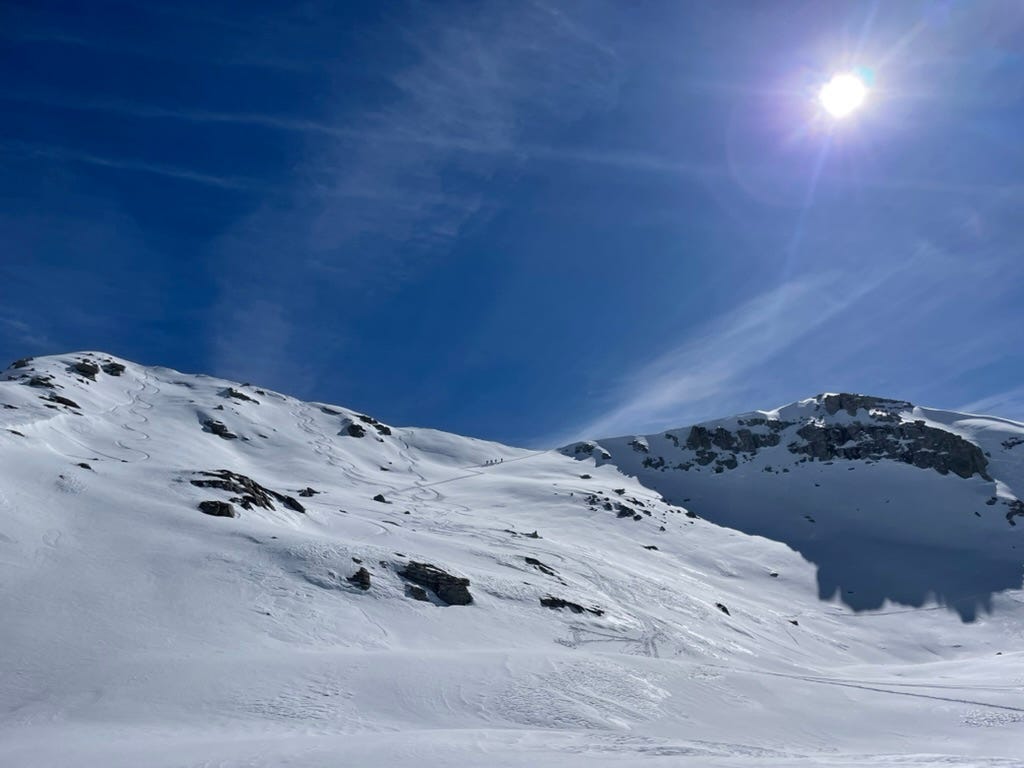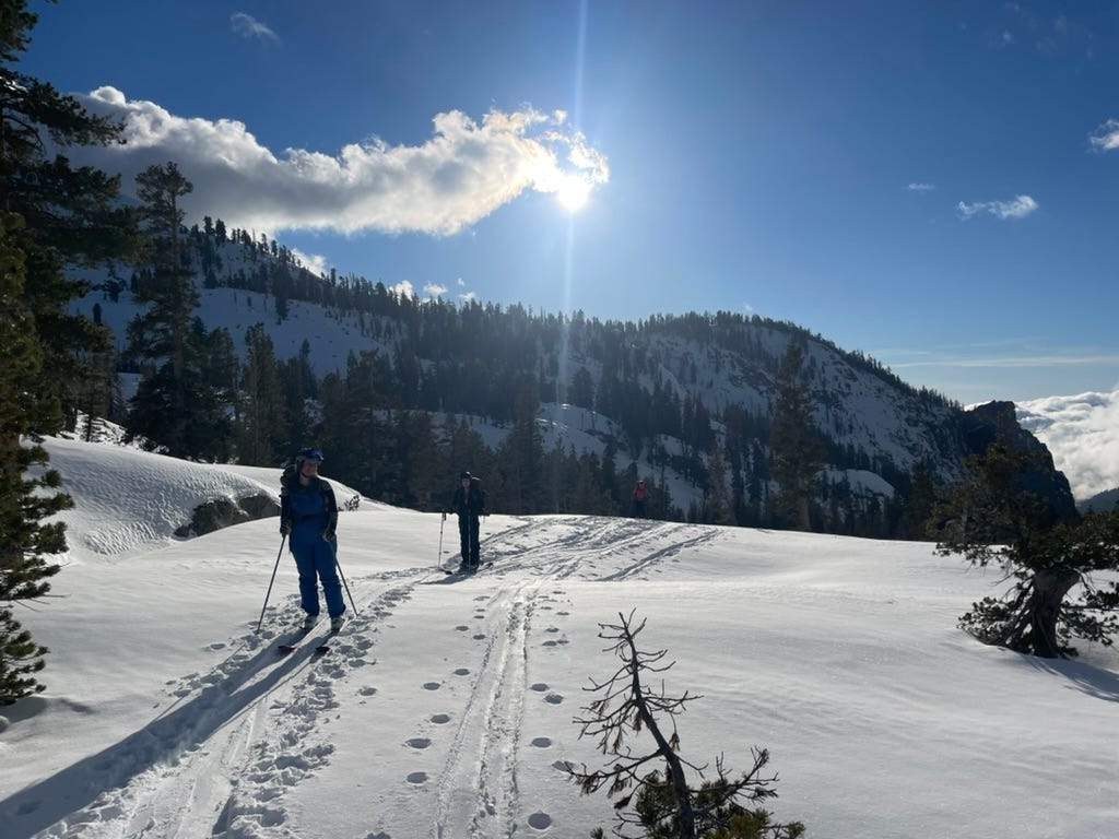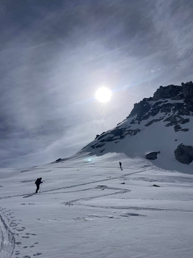 Our backcountry skinning crew is a party of five - myself, my sister and her friends Jon, Tommy and Rachel. Jon skins up on a splitboard, with two ski halves that will clip together into a snowboard for the descent. Tommy serves as our unofficial guide, refreshing the topo map to make sure we are following our intended path. Route planning means reading slope angle - under 30 degrees snow rarely slides; over 50 it rarely builds; in between is the danger zone for shifting slabs. I’m reassured that Tommy, Rachel and Jon, all of whom are experienced with overland snow travel, are also new parents, making decisions with their little ones at home in mind.