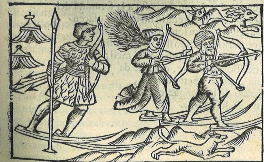 To travel in the backcountry - what the Europeans call skiing off-piste - you need to be able to move uphill under your own power. The preferred way to do that is to use something called skins, once literal animal hides, now a synthetic cover that sticks to the bottom of your skis. The first account of skins appears in Olaus Magnus’ A History of the Northern Peoples in 1555, detailing Norwegian travelers using the directional fur of the ‘skin of a young fawn’ to slide up the hill but not back:“when they ascend to a place they may not fall backward: because the hair will rise like spears… and by an admirable power of Nature hinder them from falling down.”